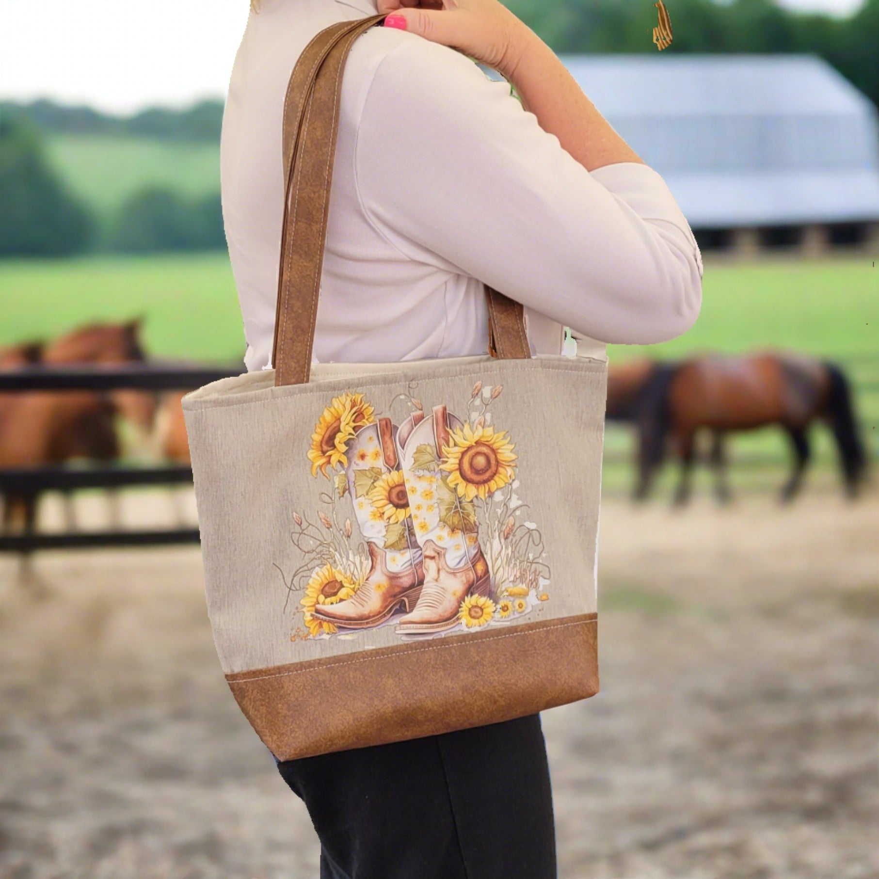 This hand-crafted Shoulder Bag is for the country girl at heart. It's made of vegan leather and thick linen-look cotton. With its unique design, attention to detail and gorgeous vinyl heat applique, it's the perfect accessory for any rural adventure. Don't be afraid to let your country roots show with this charming bag. It's a great gift for you or for your favorite Country Gal. Yee haw!
